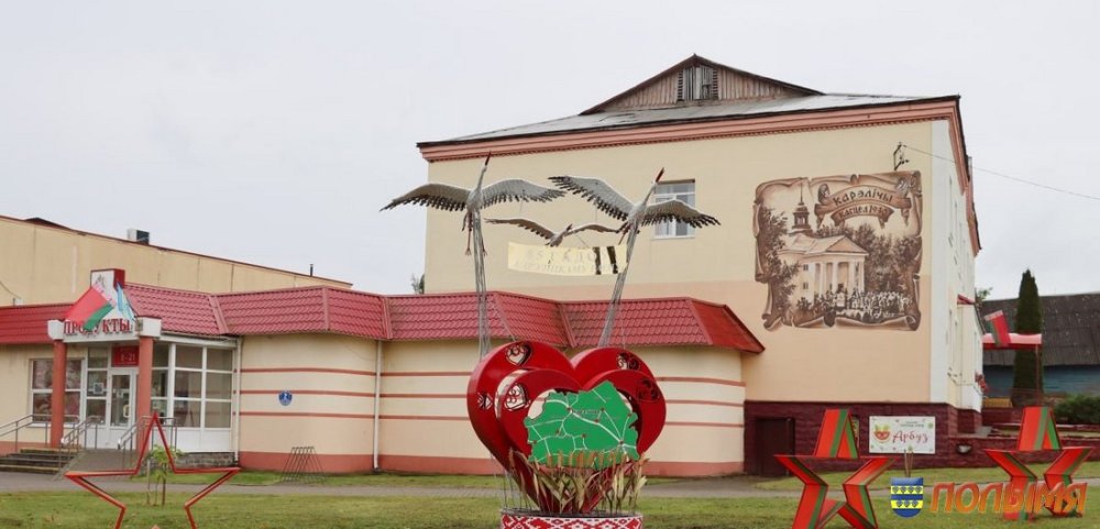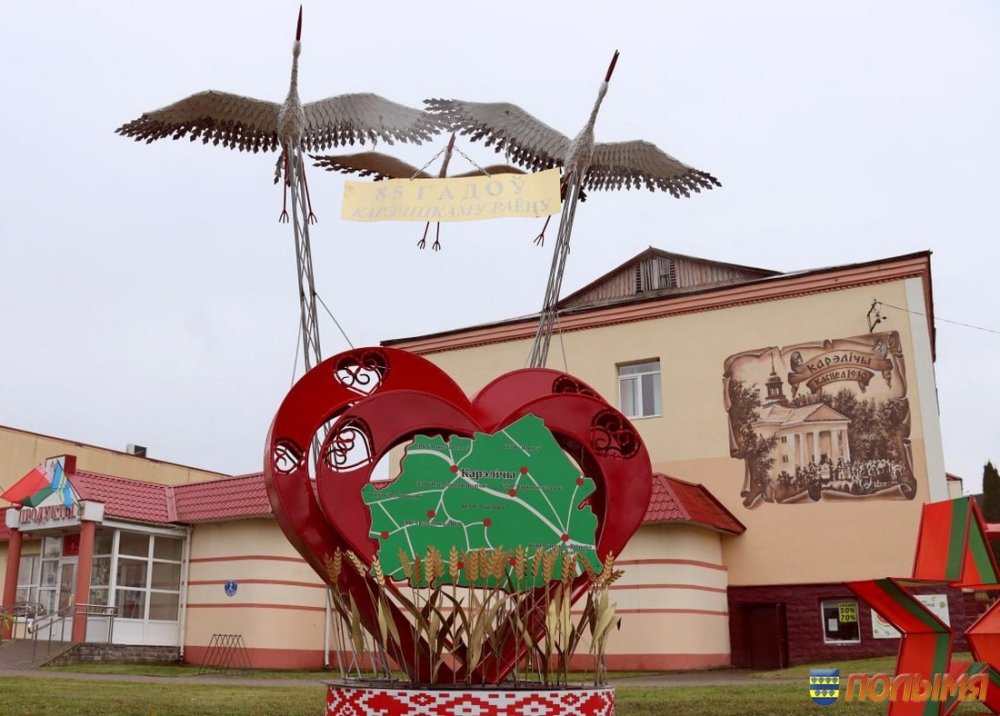 Над сердцем пролетают аисты, держа в клюве надпись «85 гадоў Карэліцкаму раёну».