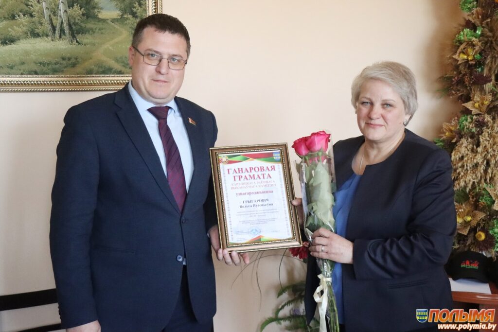 Теплые слова признательности от всего руководства Кореличского райисполкома и от себя лично выразил заместитель председателя Кореличского райисполкома Евгений Чичкан и вручил Почетную грамоту Кореличского районного исполнительного комитета. К поздравлениям присоединилась председатель райкома профсоюза работников АПК Ирина Пеньковская, которая отметила многолетний труд Ольги Евгеньевны Почетной грамотой.