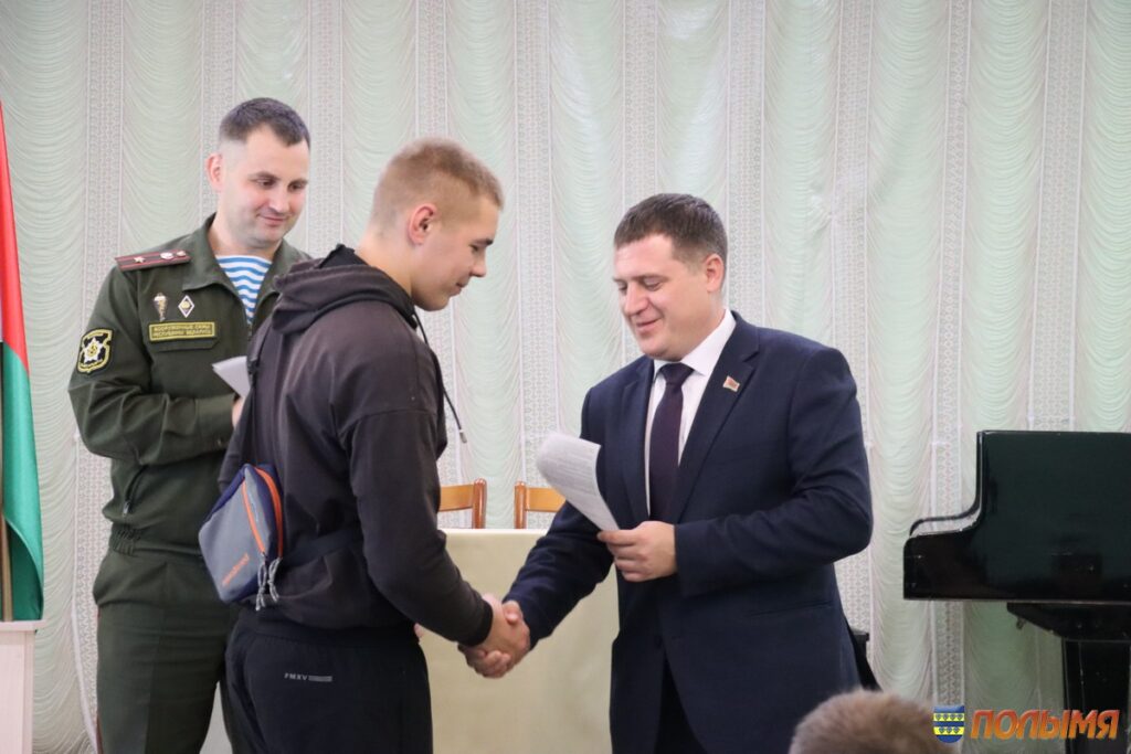 Евгений Горлукевич вместе с Евгением Чичканом торжественно вручили 32 призывникам повестки с напутствиями и пожеланиями успехов в военной службе.