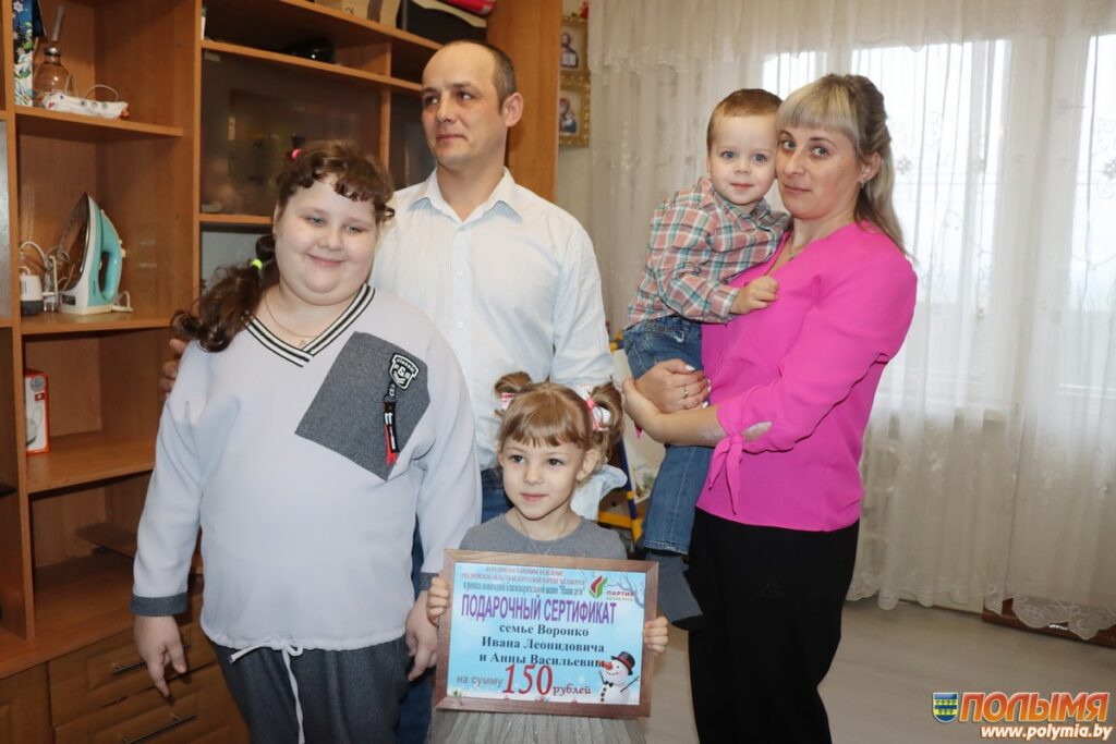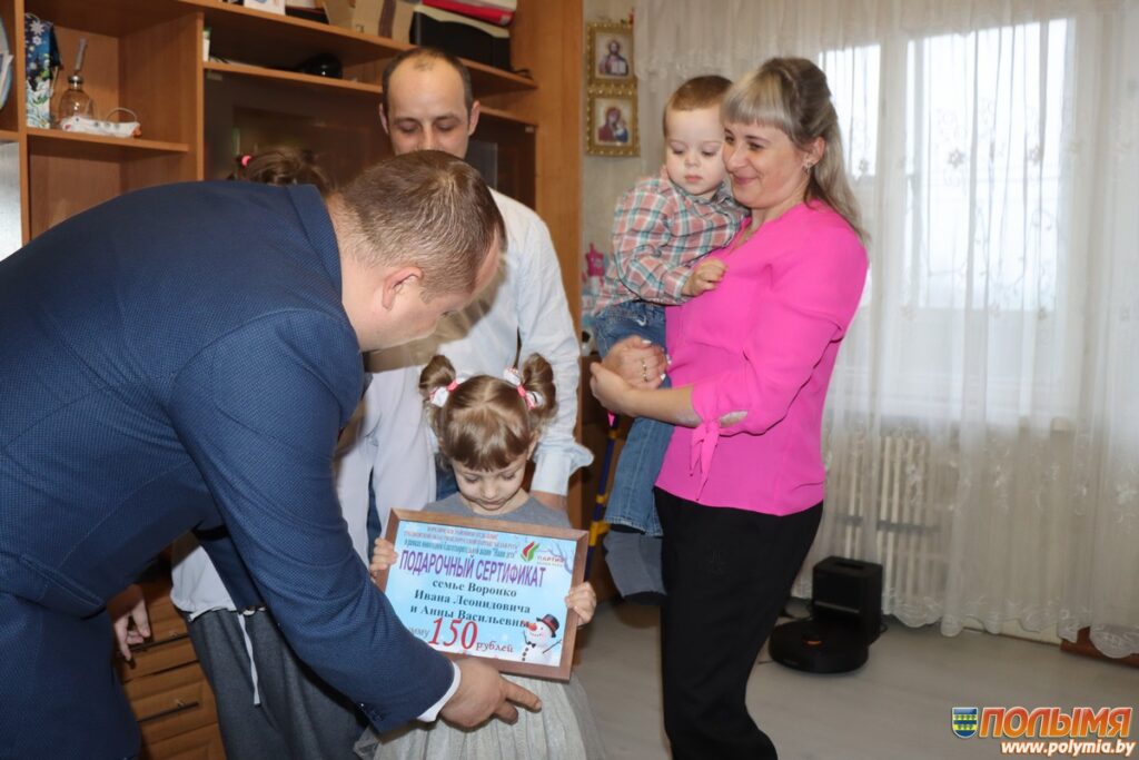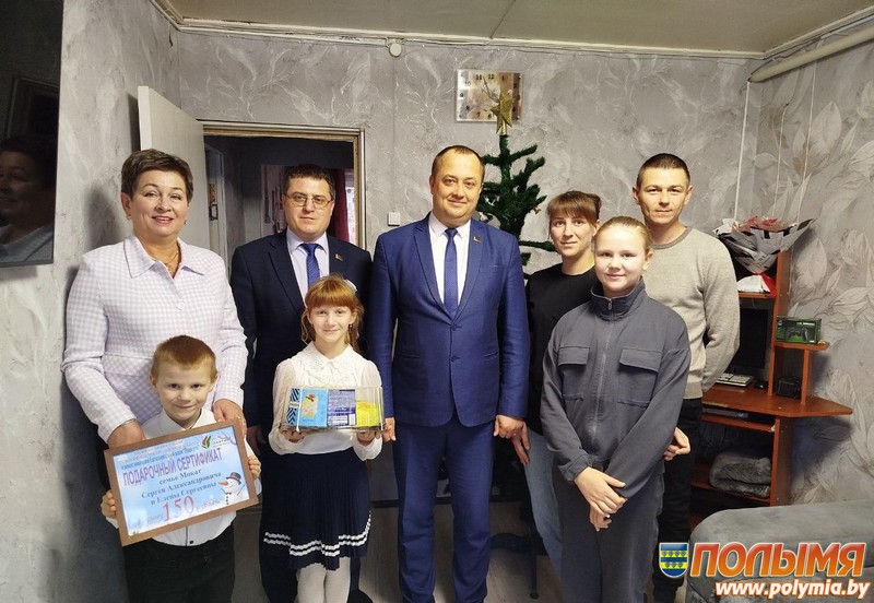 Председатель Кореличского райисполкома Александр Курило, заместитель председателя райисполкома, председатель районного отделения партии «Белая Русь» Евгений Чичкан и начальник отдела образования райисполкома, председатель районного отделения Фонда мира Ирина Осташевич отправились к многодетным семьям с подарками и добрыми пожеланиями.
