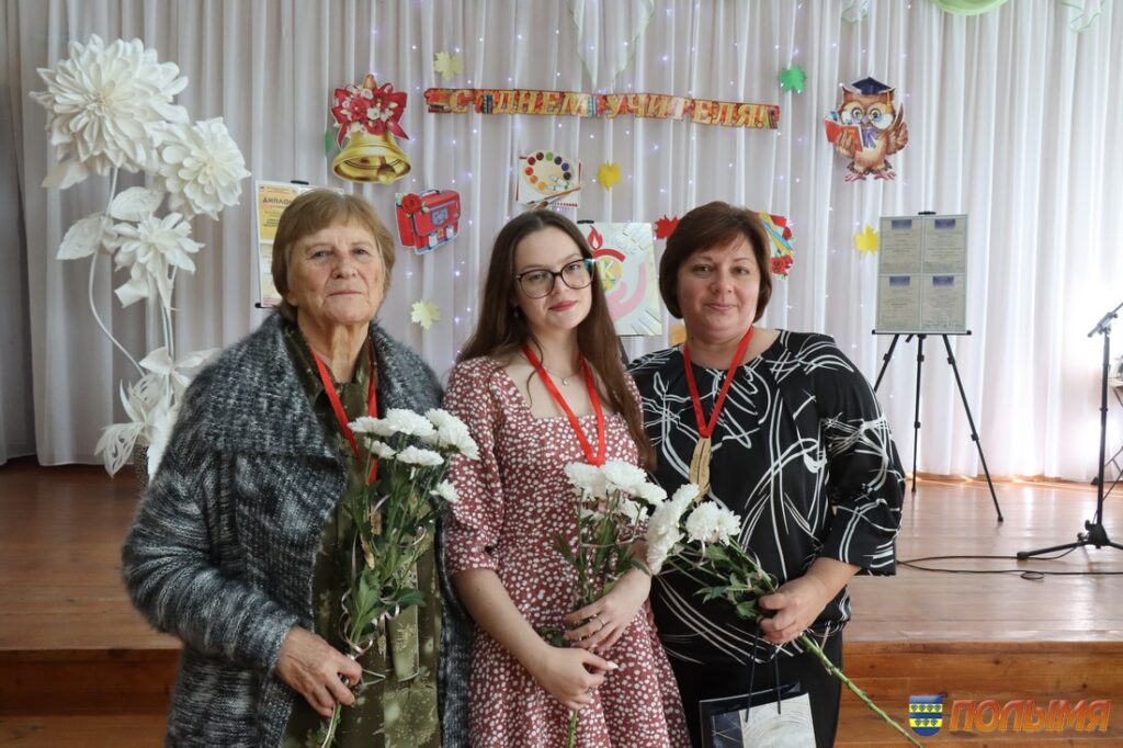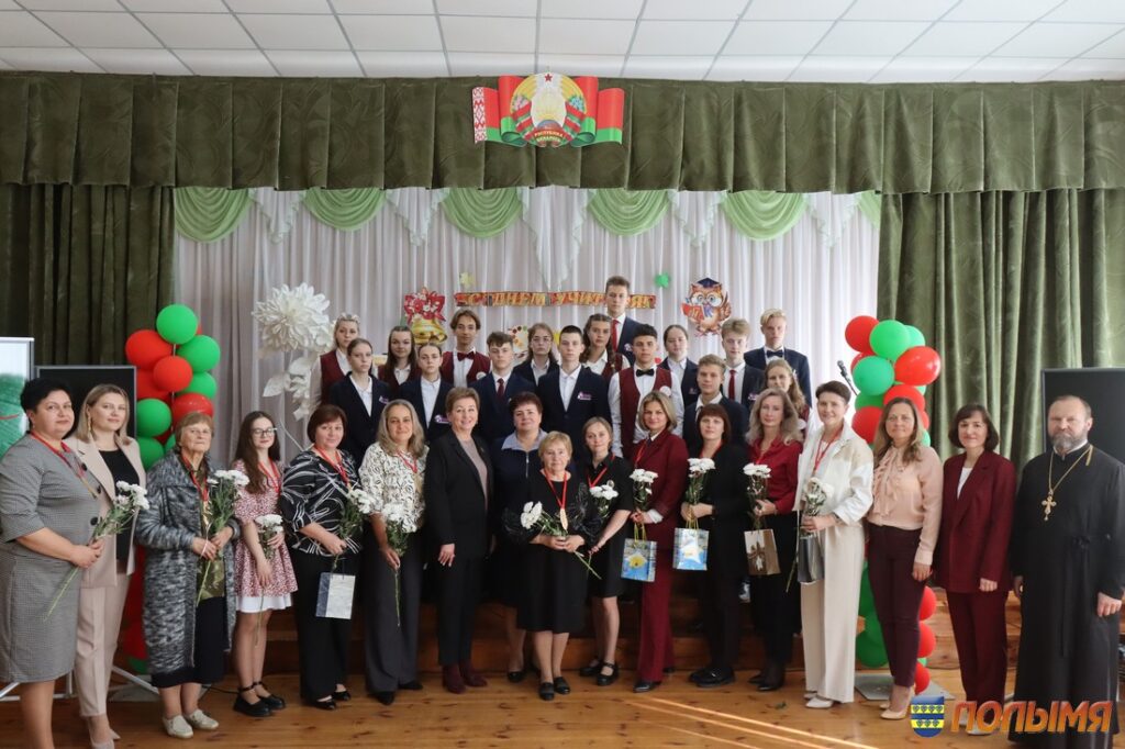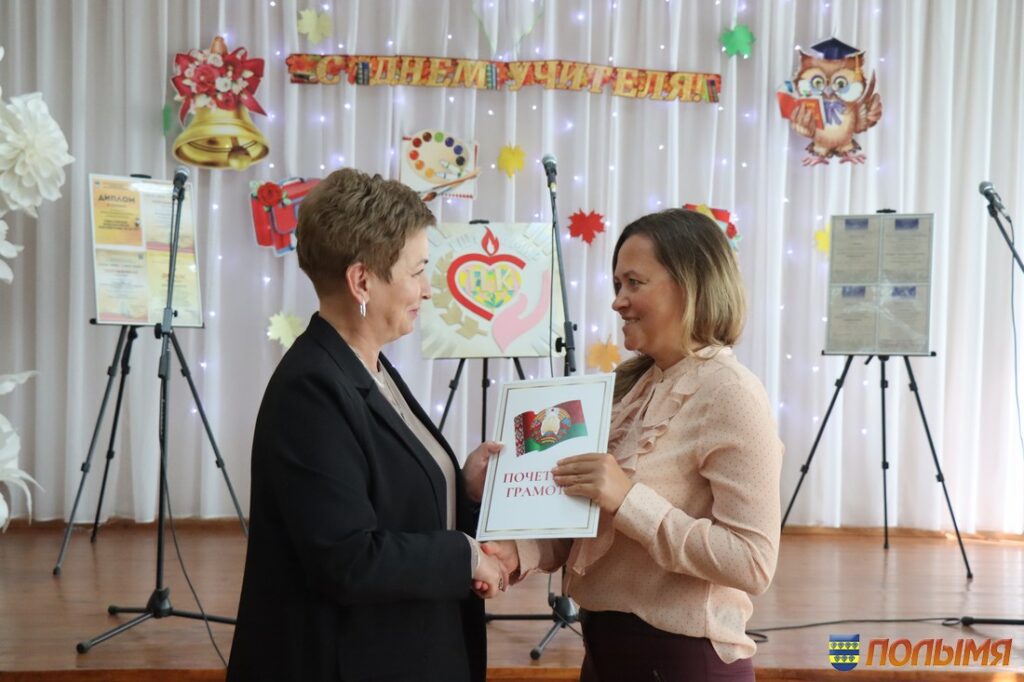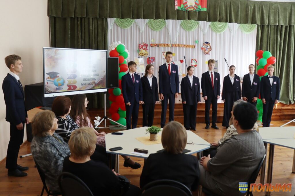 — Самое большое достижение любого учителя — это его ученики. Двое из них сегодня в зале. Это директор школы Татьяна Ильинична Шаплыко и учитель белорусского языка и литературы Елена Алиевна Смольская. Еще в детстве их отличали старательность и прилежность, высокое чувство ответственности. Теперь это опытные педагоги, мастера своего дела, которыми гордятся их учителя.