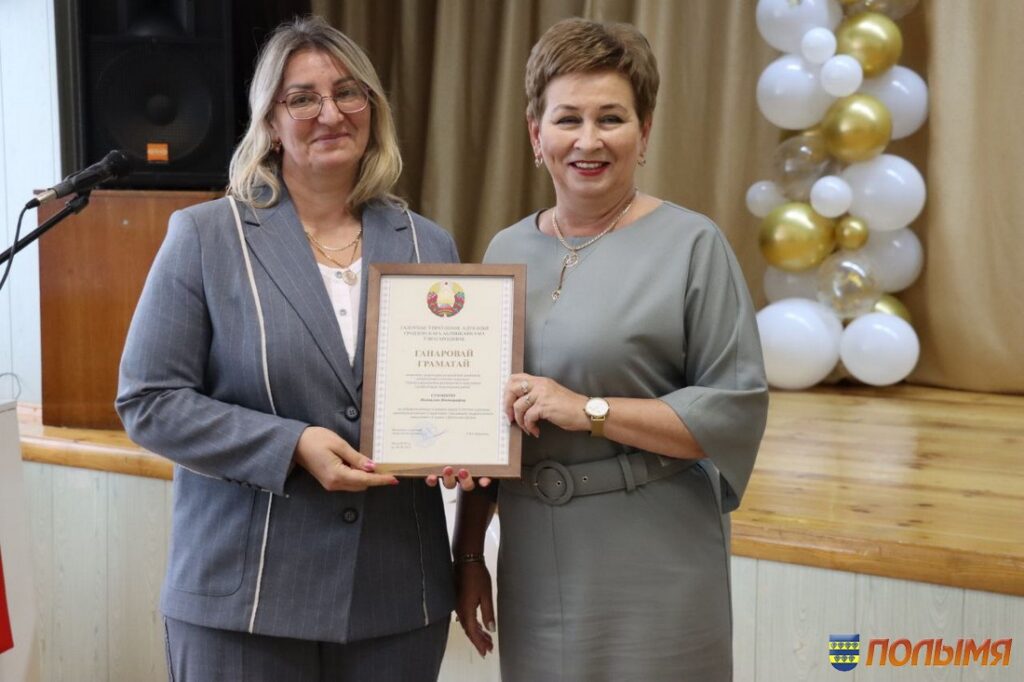 Председатель районной организации Белорусского профсоюза работников образования и науки Ирина Кучко вручила Почетные грамоты первичной профсоюзной организации учителю английского языка СШ N°1 г.п. Кореличи Елене Буй и учителю физической культуры и здоровья СШ N°1 г.п. Кореличи Алексею Бую.