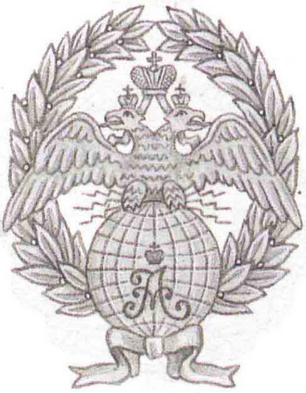 Знак был утвержден 18 января 1917 г. Венок из лавровых ветвей, завязанный лентой. На него наложен двуглавый орел под тремя Императорскими коронами, держащий в лапах стрелы, под ним – географический глобус, на котором помещен вензель императора Александра II.