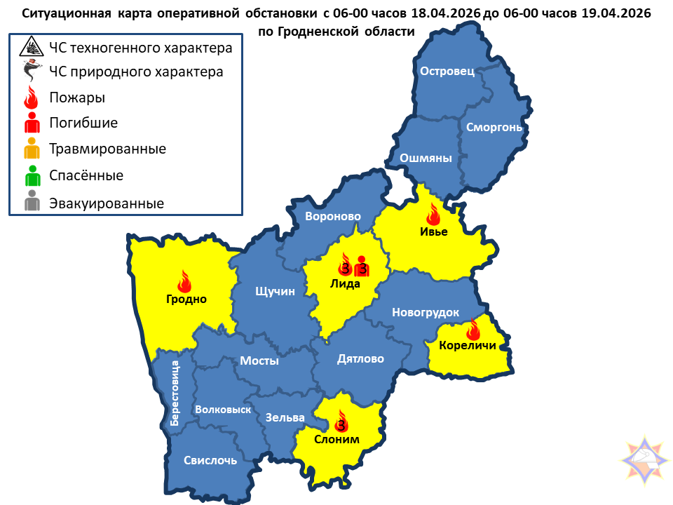 За сутки подразделениями МЧС области совершено 48 выездов, из них: 9 – на пожары: Слонимский район – пожар хозяйственной постройки; Слонимский район – пожар хозяйственной постройки; Слонимский район – пожар хозяйственной постройки; Лидский район – пожар хозяйственной постройки; Гродненский район – пожар нежилого дома; Кореличский район – пожар хозяйственной постройки; Лидский район – пожар легкового автомобиля; Ивьевский район – пожар нежилого дома. Лидский район – пожар жилого дома, погибло 3 человека.