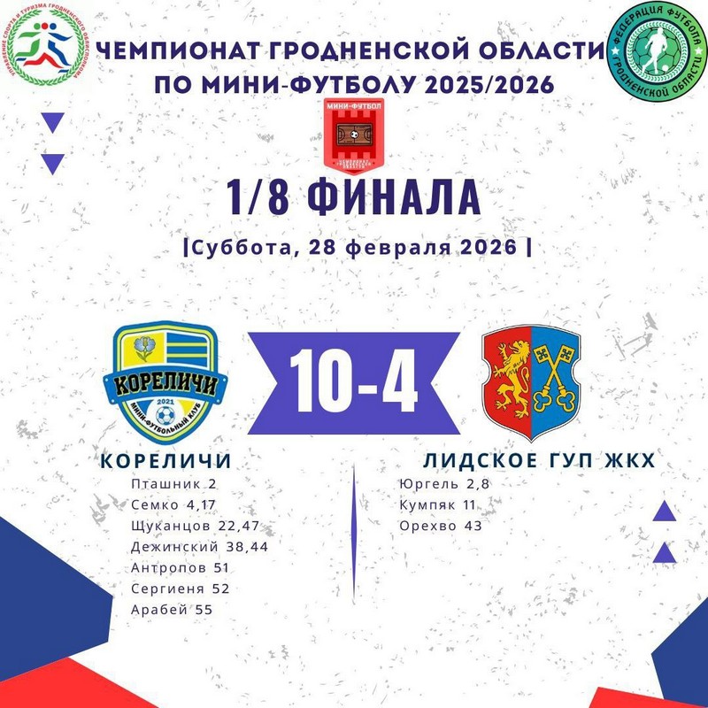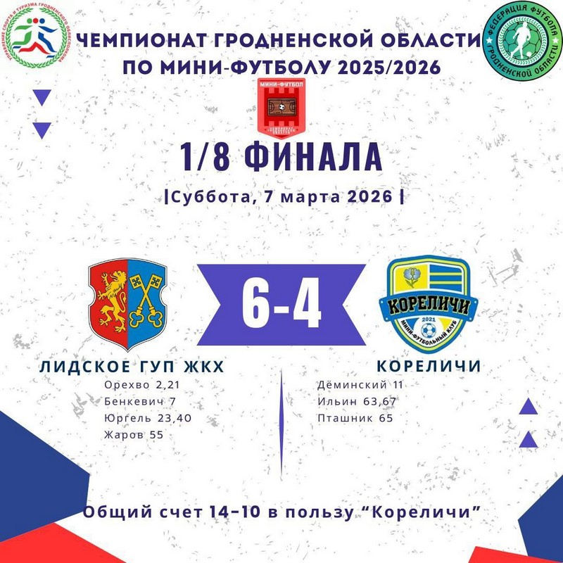 Наше противостояние с командой из Лиды получилось ярким, напряжённым и по‑настоящему плей‑оффным. По сумме двух матчей МФК Кореличи одержал победу с общим счётом 14:10 и уверенно прошёл в следующую стадию турнира