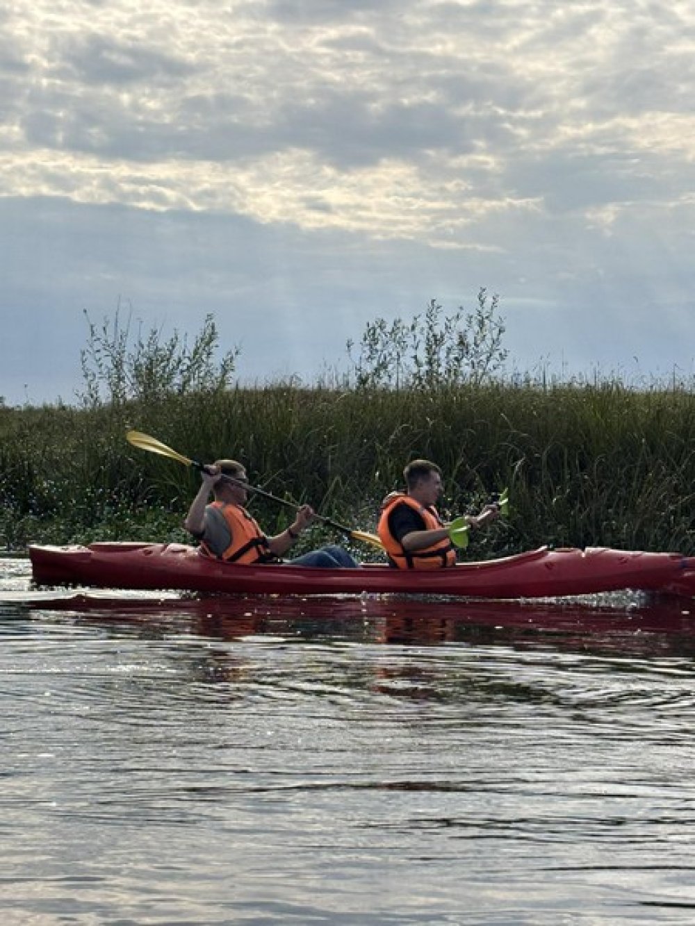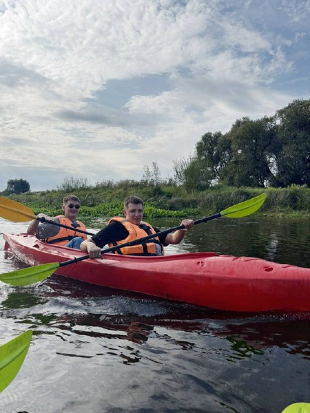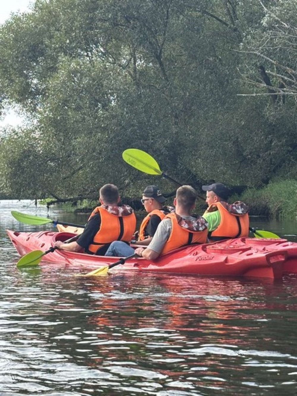 Сам сплав превзошёл все ожидания. Вода ласково покачивала наше судно, а вокруг раскинулись живописные берега с густыми лесами и чистым воздухом. Мы ловили моменты тишины, наслаждались пением птиц и компанией друг друга. Байдарка заставляет работать в команде, помогая понять, как важно двигаться вместе — и это здорово сближает.