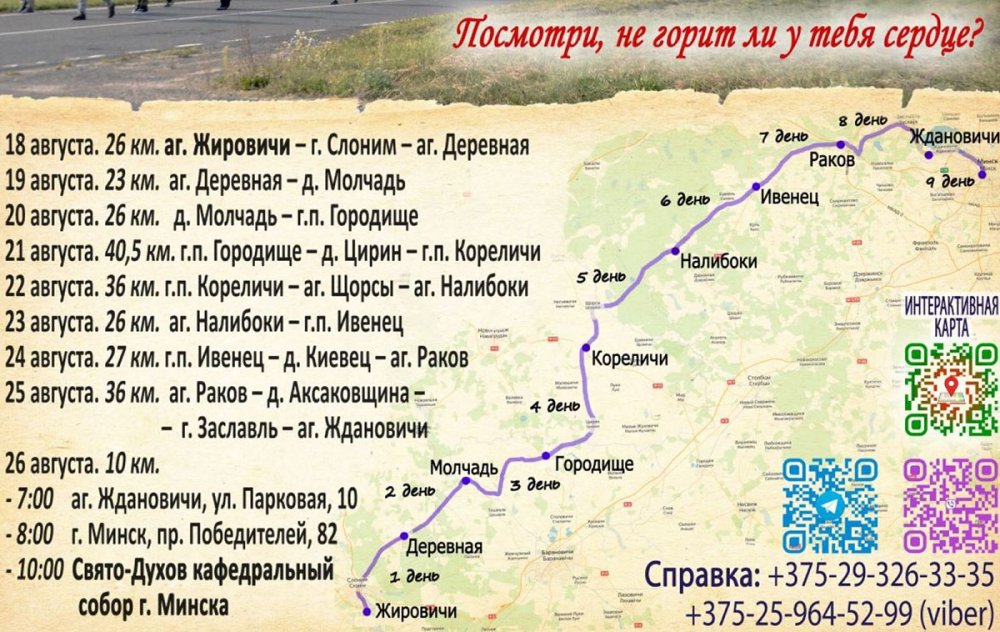 22 августа паломники планируют пройти 36 километров по маршруту Кореличи-Щорсы-Налибоки. Пешее молитвенное путешествие завершится 26 августа в Свято-Духовом кафедральном соборе г. Минска.