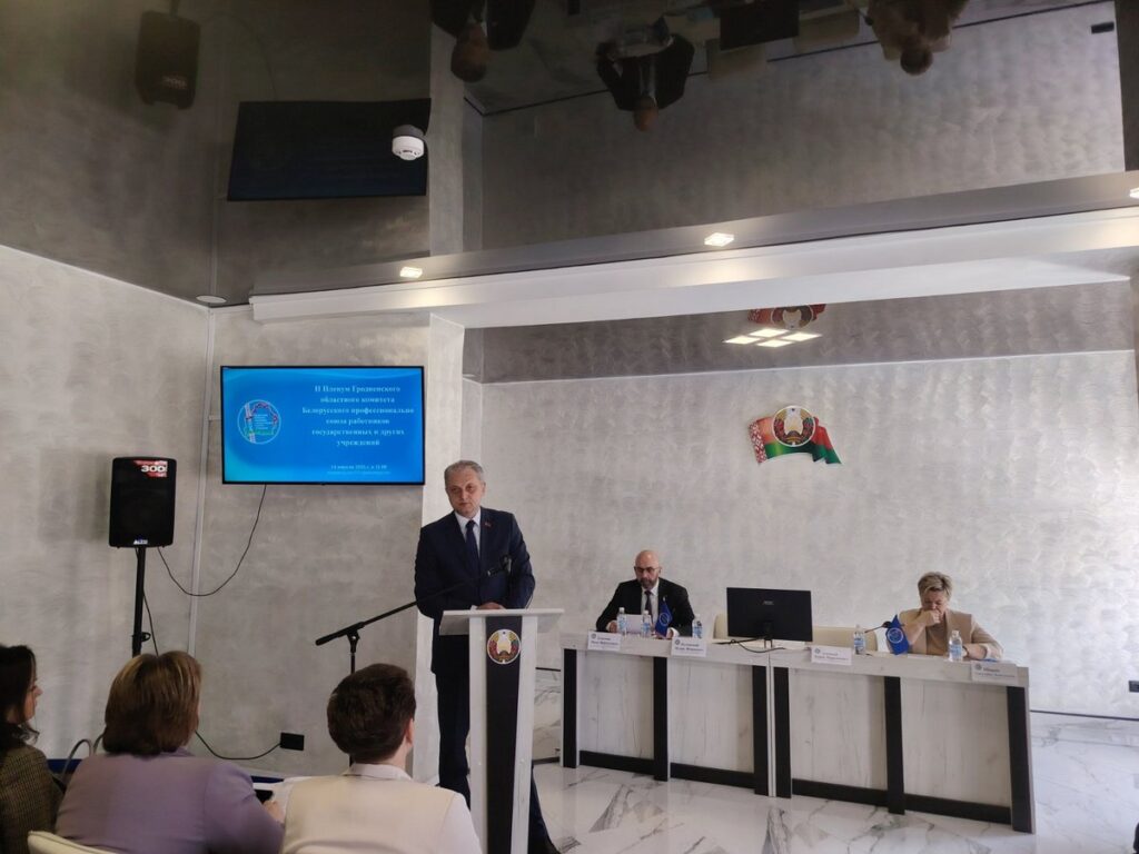 14 апреля 2026 г. Член Постоянной комиссии Совета Республики по экономике, бюджету и финансам, начальник главного финансового управления Гродненского облисполкома Павел Ошурик принял участие в заседании Пленума Гродненского областного комитета Белорусского профсоюза работников государственных и других учреждений по утверждению отчета о работе за 2025 и задачах на 2026 год.